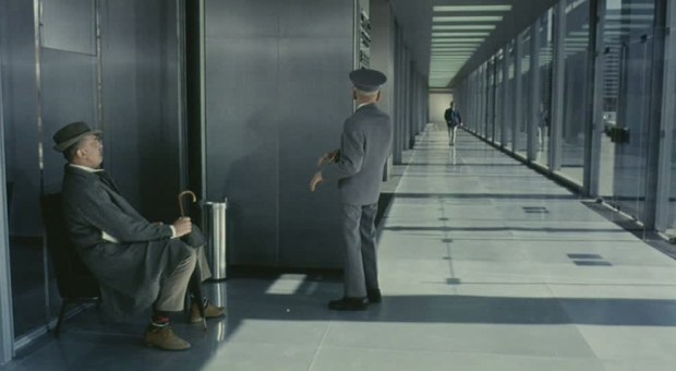 La forma como Tati juega con el espacio en esta película es absolutamente magistral. Playtime es casi una película abstracta, plagada de espacios fríos, geométricos, vacíos y deshumanizados. Dominan los colores azules y grisáceos así como las líneas rectas. La primera parte del film es la representación literal de cómo Monsieur Hulot intenta adaptarse y entender esos espacios sin éxito. Pasillos laberínticos, puertas que se confunden con paredes, oficinas que son tan similares entre sí que uno no puede distinguirlas… es una demoledora y acertadísima descripción del mundo moderno: frío, aburrido y descolorido. Hay un momento especialmente sugerente cuando Hulot espera que le atienda un ejecutivo en un sala de paredes de cristal. Aburrido de esperar, se levanta del sillón y observa la calle. El plano de Hulot observando el bullicio de la ciudad desde dentro de esa oficina transparente, que es casi como una cárcel de cristal, es uno de los momentos visuales más sobresalientes del film.