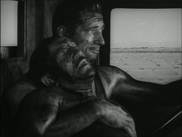 A partir de ahí, Jo ya no es más que un despojo cubierto de petróleo, una sombra de sí mismo, los restos que quedan del arrogante Jo que llegó al poblado. Mario entonces se compadece de él prometiéndole que sobrevivirá y recibirán su recompensa, pero Jo muere antes de llegar al destino. Al recibir Mario la noticia de que su compañero estaba muerto, se desmaya y los obreros del pozo petrolífero comentan lo unidos que estaban.