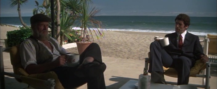 A lo largo del metraje se nota también el contraste entre Marlowe y el resto de personajes, por ejemplo su vestimenta más clásica en contraste con la ropa más informal del resto (por no hablar de sus vecinas semidesnudas). Uno no puede evitar tener la sensación constante de que ese personaje no acaba de encajar en ese universo, y aunque se desenvuelve bien durante la investigación tampoco parece un tipo tan duro como un Humphrey Bogart. En la que es una de las escenas más violentas de la película, un gangster le estampa una botella de cristal a la cara de su chica favorita solo para demostrarle a Marlowe que no tiene miramientos con nadie. La única reacción de Marlowe es de sorpresa e impotencia. Aunque en todo momento mantiene su pose irónica es sin duda un Marlowe mucho más vulnerable que el prototipo clásico.