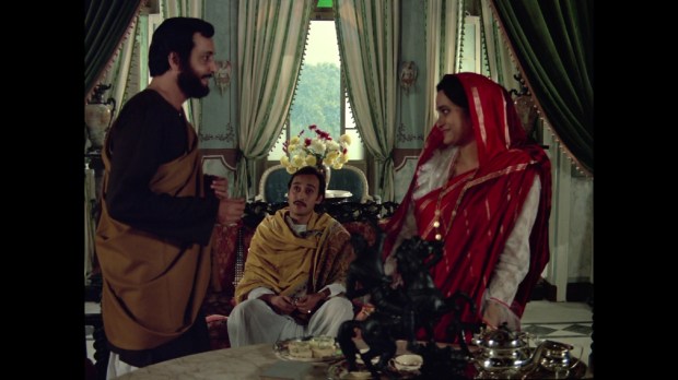 De entrada, hay un elemento que llama poderosamente la atención de El Mundo de Bimala desde los primeros minutos de metraje y es el impresionante acabado visual de la película. De todos los filmes que he podido ver de Ray me atrevería a decir que éste es el que hace un mejor uso del color y de los que cuentan con una fotografía más cuidada, especialmente en los planos interiores. En los últimos años de su vida, Ray se vio obligado a restringir la mayor parte de la acción de sus películas en espacios interiores – luego profundizaremos en eso – pero no hay punto de comparación en la forma como le saca partido aquí respecto a sus obras posteriores: los planos iluminados prácticamente solo con velas tienen una belleza pictórica, mientras que la cámara se recrea en todos los pequeños objetos, el mobiliario de la casa y sobre todo los espejos. En este aspecto es el filme de Ray que mejor entra por los ojos junto a La Canción del Camino.