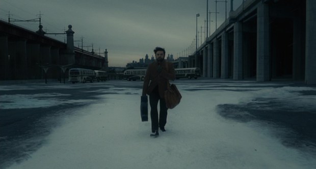 Antes dije que este era un filme que no romantizaba al perdedor, y esto es así con todas sus consecuencias. El Llewyn Davis que tan bien ha sabido perfilar Oscar Isaac es ciertamente un hombre de principios, que cuando se cita con el jefe de una discográfica para conseguir un contrato rechaza la oferta de formar parte de un grupo. Él cree en defender su música tal cual es, sin necesidad de comercializarse. Pero también es un imbécil. Un gorrón que, como no tiene donde caerse muerto, intenta colarse en cualquier apartamento donde haya un sofá para él. Un tipo temperamental que se discute con un encantador matrimonio que le han acogido por ser admiradores de su música, y que durante la actuación de una anciana música folk en un club se emborracha y se burla de ella. Alguien que da muestras de una absoluta sensibilidad cuando interpreta sus canciones pero que luego tiene una empatía nula en sus relaciones con las mujeres.