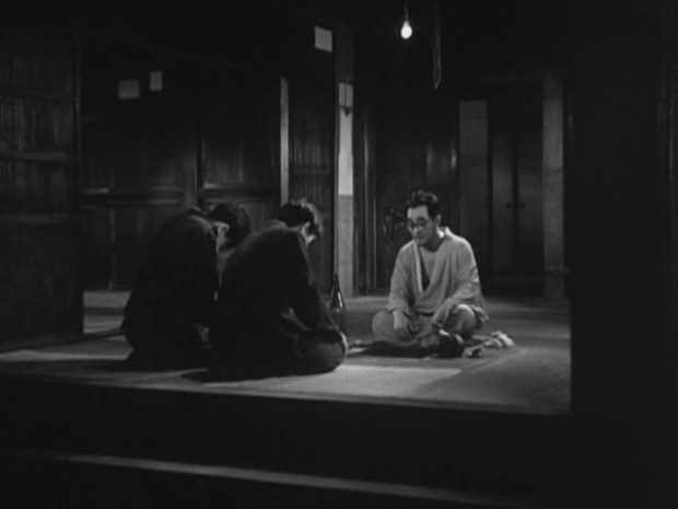 Solo hacia el final, cuando Saheita decide que no es justo seguir dando largas al cobrador de la deuda y para ello decide empeñar todos sus bienes, parece que Shimizu se atreve por fin a llegar al meollo de la cuestión. Dos ladrones entran a robar en su casa y Saheita se disculpa ante ellos porque no hay nada que robar y les invita a beber (tal es el humanismo de Shimizu que nos hace simpatizar hasta con ese par de ladronzuelos de poca monta). Y entonces y solo entonces Saheita nos da su visión de lo sucedido: al ser el hijo de una prestigiosa familia nunca ha podido aspirar a tener un trabajo normal con el que ganarse la vida, como oficinista y campesino. ¿Qué le quedaba pues? La opción de holgazanear y beber intentando mantener el prestigio de su saga familiar comportándose como un hombre poderoso y ayudando en todo lo posible a todo el que se lo pidiera, incluso aunque eso conllevara endeudarse. Mientras Saheita se sincera ante los dos ladrones, se nos muestra unas panorámicas de las paredes y techos ahora vacíos de la mansión del protagonista, un tipo de planos muy vistosos y por ello extrañamente inusuales en el cine de Shimizu. No vamos a decir que este discurso sirva como justificante para su comportamiento, pero me parece encomiable cómo el humanismo del cineasta le lleva a querer comprender y simpatizar con todos sus personajes, incluso uno basado en una mera canción popular que solo tenía como finalidad burlarse de un hombre rico de vida disoluta. Hasta de un personaje caricaturesco así Shimizu consiguió sacar una película preciosa con un protagonista con el que es imposible no simpatizar.