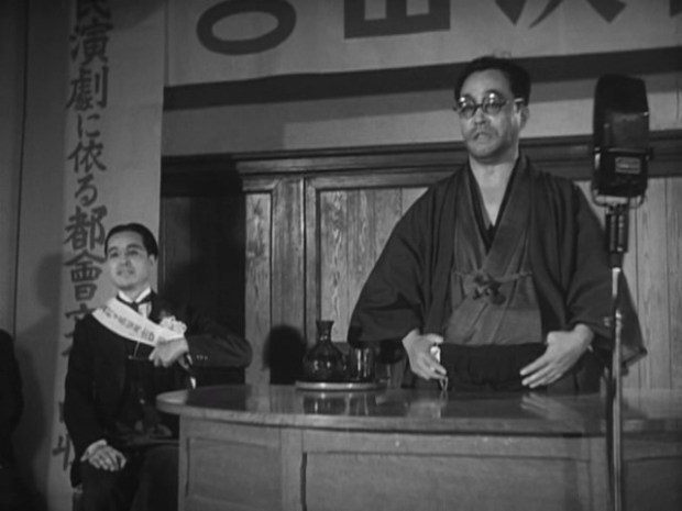 Esto tiene mucho que ver con un tema que se trataba bastante en el cine japonés de la época y que ya vimos en El Baile en la Casa Anjo (Anjô-ke no butôkai, 1947) de Kôzaburô Yoshimura, que es el cambio de los tiempos con el fin de la II Guerra Mundial. La modernidad y la occidentalización se estaban abriendo paso en Japón, y algunas viejas y respetables familias nobles como la de este filme y el de Yoshimura se encontraban de repente en una situación comprometida, con su fortuna perdida y sin que su prestigio les pudiera ser de mucha ayuda. El pequeño pueblo donde sucede la acción no es ajeno a esos cambios. Cuando Saheita intenta hacer volver a casa a la hija fugada de un hombre del pueblo, ésta se niega argumentando que en ese pueblo no tiene futuro y que quiere irse a Tokio. Más adelante en las elecciones el candidato que pide apoyo a nuestro protagonista insiste en modernizar el pueblo trayendo la electricidad y una academia de baile, siendo esto último algo que preocupa especialmente a los adultos de la población por la mala influencia que tendrá en sus hijos. No se puede negar que muchos de estos cambios son necesarios e incluso positivos, Shimizu no pretende dar a entender lo contrario, pero sí que es inevitable compartir la nostalgia que siente el protagonista hacia unos tiempos más sencillos simbolizados en el antiguo estatus de su familia, que ahora inevitablemente toca dejar atrás.