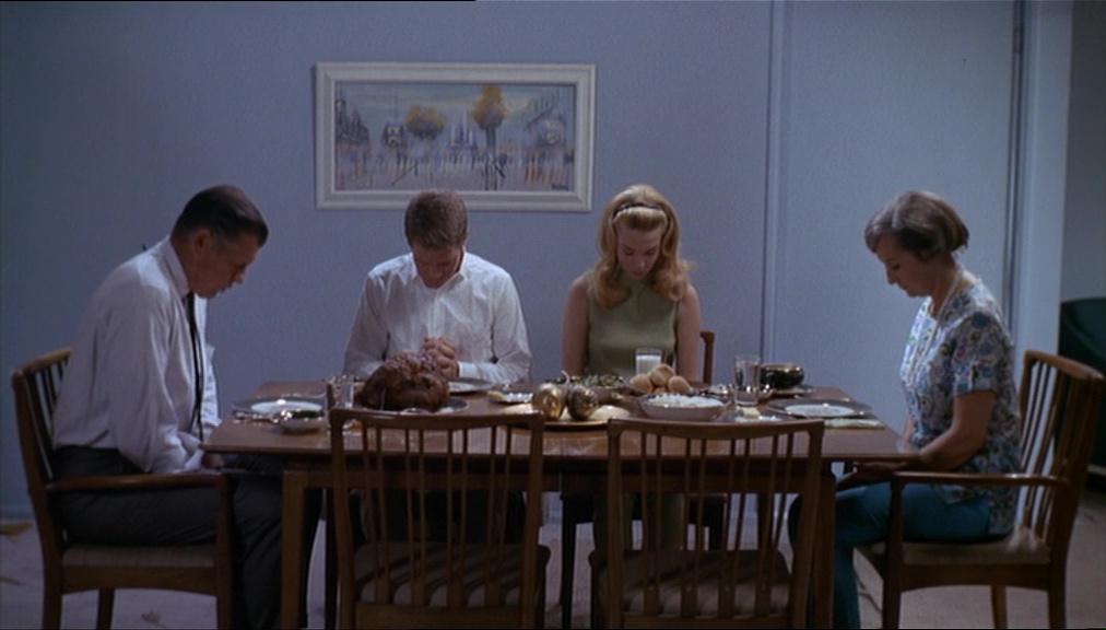 La historia de Bobby a cambio creo que tiene más alicientes a los que agarrarme, aun cuando no tengo ninguna duda de que Bogdanovich hubiera preferido centrarse en la otra subtrama. Aquí el director nos muestra a un joven situado en un contexto idílico, la representación del sueño americano con esa familia modélica, una bonita esposa y una casa con jardín. Lo interesante es cómo aquí también muestra todo ello desde cierto distanciamiento pero que funciona mejor porque transmite el que suponemos que debe ser el conflicto del personaje: su incapacidad para integrarse plenamente en ese mundo, el estar comportándose como un marido e hijo irreprochables cuando por dentro hay algo que no encaja. Y sobre todo cómo esa pasión por las armas puede pasar de un día para otro de una afición (teóricamente) inofensiva a convertirse en un peligro para la sociedad, un problema que como sabemos sigue siendo más que vigente hoy día en Estados Unidos (de hecho el personaje de Bobby está inspirado en un francotirador real de la época).