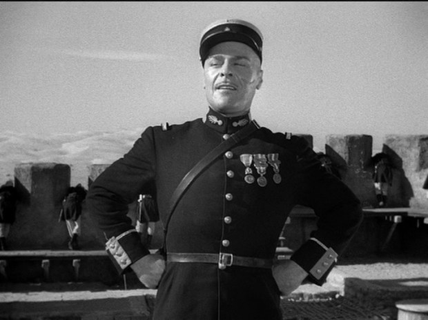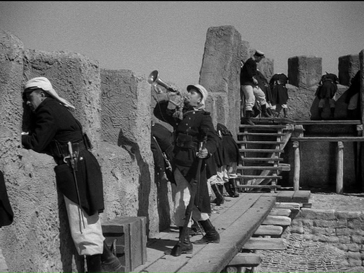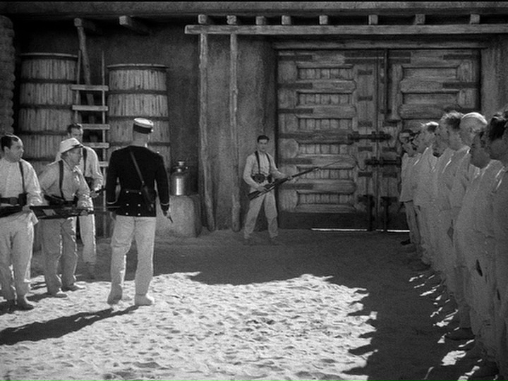 Se nota que William A. Wellman entiende cuáles son los principales elementos a resaltar del guion y hace un trabajo extraordinario de realización. De entrada, sabe utilizar a la perfección a su carismático reparto (no se pierdan a todo un Broderick Crawford en un papel secundario) dejándoles que brillen en las escenas basadas en la interacción entre ellos. Eso me resulta especialmente remarcable en la charla que tienen Beau y John hacia el final, en que cada uno le explica al otro lo que tiene que hacer si muere en el próximo ataque, una escena exenta de sentimentalismo pero igualmente emotiva. Al mismo tiempo, en los instantes de más tensión Wellman realiza unas composiciones de planos impecables, como puede verse en el momento en que el Sargento Markoff quiere obligar a los protagonistas a fusilar a los dos iniciadores del motín. Tenemos ahí varios puntos de tensión a la vez: los protagonistas expuestos a la posible represalia de Markoff por desobedecerle, Markoff amenazándoles con un arma, todos los soldados amotinados preparados para estallar aún estando desarmados al saber que son mayoría y los dos que dan apoyo a Markoff que deben controlar a la multitud y a los hermanos Geste, que no saben si siguen siendo aliados suyos o no. La forma como va combinando los diferentes personajes mediante el montaje y la gradación de planos transmitiendo una tensión a punto de estallar es magnífica.