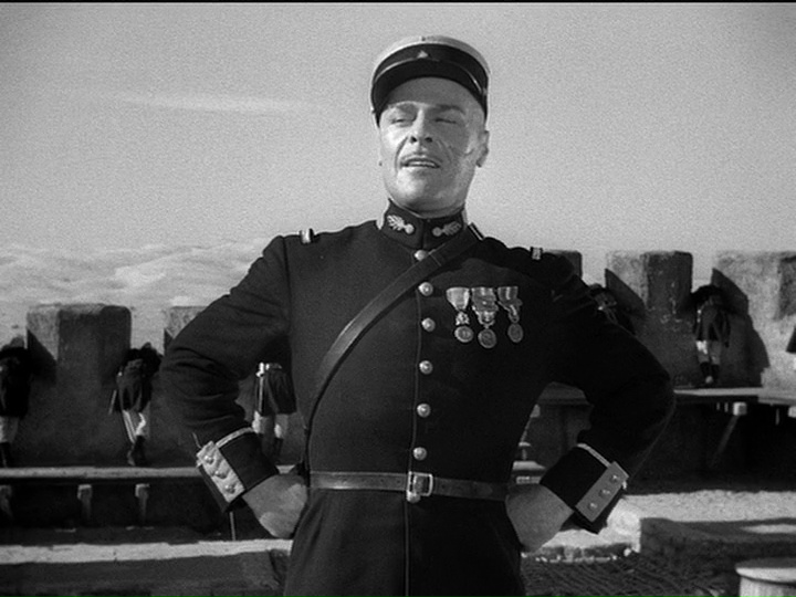 Me gusta mucho la entrada en escena del Sargento Markoff, magistralmente interpretado por un Brian Donlevy que, según asegura Manuel en el post antes citado, en la vida real era tan poco amigable como su personaje. Nada más ver a esos reclutas suelta en menos de un minuto todas las frases tópicas que hemos oído en películas bélicas del estilo («¡Sois el peor regimiento que he visto en mi vida!«, «Haré de vosotros auténticos soldados aunque la mitad de vosotros caiga por el camino«, etc.) y enseguida se revela como el claro antagonista… pero un carismático antagonista. No en vano, cuando son atacados por los árabes, sus estrategias para hacerles frente con tan pocos hombres son, hay que reconocerlo, brillantes. El propio Beau reconoce que, por mucho que le odie, es uno de los mejores soldados que ha visto. La estrategia más escalofriante de todas es cuando exige a los pocos supervivientes que quedan que se rían a carcajadas para hacer creer al enemigo que están tranquilos en el fuerte, seguros de su victoria. Resulta escalofriante ver a esos hombres derrotados y convencidos de su próxima muerte forzar esas risas hasta que se acaban contagiando y ríen de verdad. Para mí es uno de los mejores momentos de la película por lo singular y extraño que resulta.