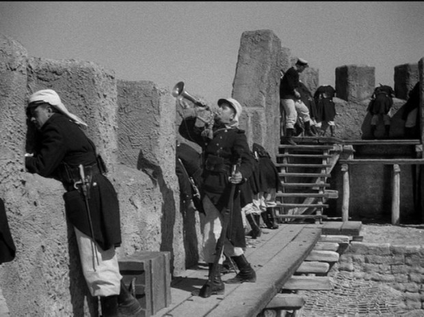 El inicio de Beau Geste (1939) de William A. Wellman puede que sea uno de los más memorables de todo el Hollywood clásico. Un grupo de legionarios franceses se acerca a un fuerte que ha sido atacado recientemente por tropas árabes a darles ayuda, pero aunque hay hombres apostados en cada torre, todo está en extraño silencio. Un disparo llega del fuerte. Piensan contraatacar, pero nada más sucede. El corneta se ofrece para subir por la muralla y ver qué está sucediendo…. pero después de un largo rato de espera parece que no se decide a regresar. Cuando el oficial al mando entra a ver qué está sucediendo se encuentre un fuerte fantasma: todos los soldados están muertos, estaban colocados con sus rifles sobre el muro para dar la falsa impresión de que defendían el fuerte. Ni rastro del corneta. Llega otro ataque imprevisto de los árabes que obliga a la tropa a dejar el fuerte y replegarse en el desierto. Y entonces, sorpresa: un incendio arrasa el fuerte. ¿Qué ha sucedido?