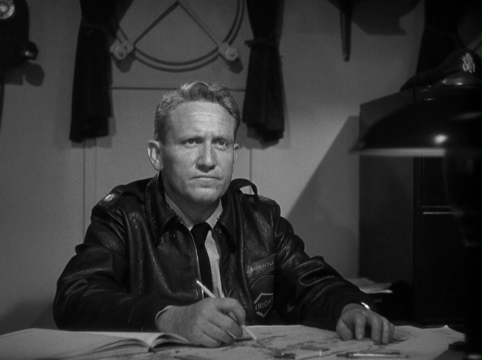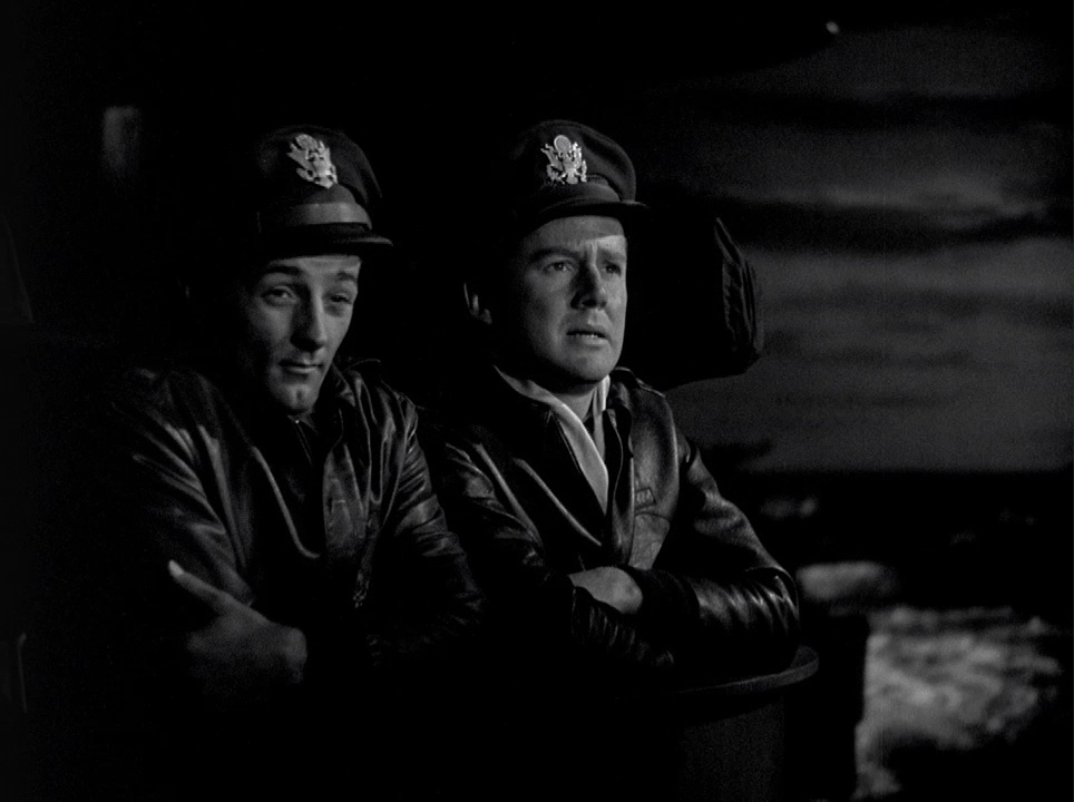 El mismo reproche se le puede achacar a la subtrama en que el Capitán Lawson se reencuentra con su joven esposa Ellen mientras el primero está entrenando en la base, que es para mí el aspecto más negativo de todo el filme. Su historia de amor es bonita, pero se alarga demasiado para no ofrecer nada a cambio, y los actores protagonistas, Van Johnson y Phyllis Thaxter, están muy bien pero carecen de ese carisma extra que sostiene este tipo de escenas cuando no se apoyan en un guion sólido. Ya no les reprocho siquiera la existencia de algún conflicto entre ellos (ella parece tener maravillosamente asumido que su joven esposo se haya presentado voluntario a una misión suicida dejándola a ella sola y embarazada), pero sí al menos alguna estampa memorable, alguna de esas instantáneas que uno recuerda después de la película. Desafortunadamente los personajes no tienen suficiente personalidad como para que podamos «disfrutar con ellos» de su historia de amor – en contraste, uno podría pasarse horas compartiendo los momentos de intimidad de la pareja de Breve Encuentro (Brief Encounter, 1945) de David Lean sin aburrirse – y el guion de Dalton Trumbo no logra extraer nada especial de esta subtrama que parece alargada artificialmente para dotar al filme de la consabida «historia de amor».