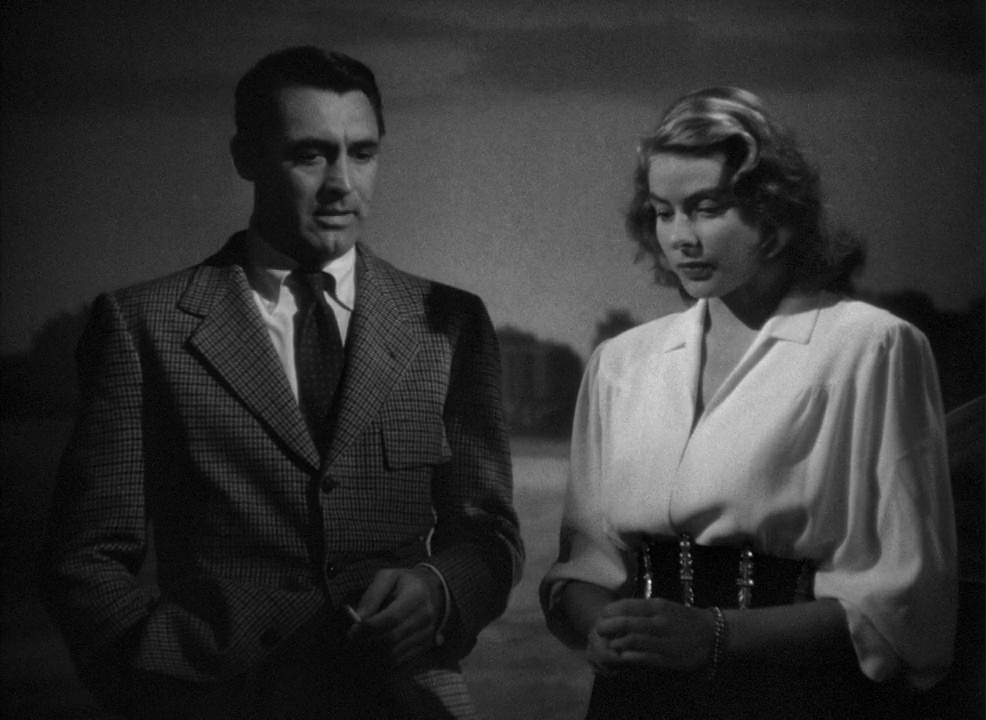 Lo que hace que este juego a dos bandas funcione tan bien se debe a varios factores, entre ellos el soberbio trio protagonista formado por Cary Grant, Ingrid Bergman y Claude Rains. Devlin (Grant) es el que encarna la ley en su máxima expresión pero a cambio es el más perverso de los tres. Desprecia a Alicia, y cuando ésta intenta enmendarse de su pasado promiscuo y alcoholizado él responde siempre con frases cáusticas y mordaces. Solo un actor de la talla de Grant podría lograr que el personaje funcionara, desplegando esa faceta cínica pero con un componente romántico y vulnerable que se niega a dejar mostrar del todo. La química que hay entre él y el personaje de Ingrid Bergman es tan visible y está tan bien captada por Hitchcock que de esta forma compensa la crueldad con que él la trata en ocasiones, porque intuimos que es todo una máscara. Esto se nos confirmará de hecho en el único momento de la película en que defiende a Alice… que es, triste y significativamente, en una escena en que ella no está para oírlo: una reunión con otros agentes secretos en que uno habla despectivamente de ella como una mujer de baja catadura moral, y Devlin responde sarcásticamente sobre cómo mientras Alice se juega la vida la esposa de dicho agente está jugando al bridge.