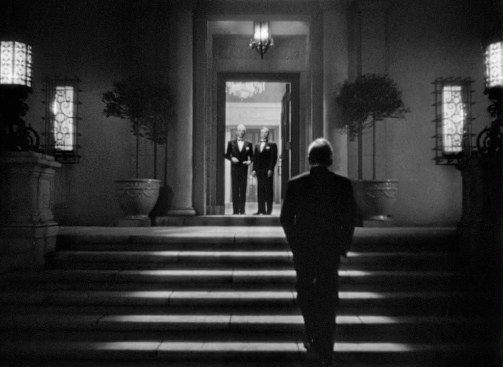 Uno de los aspectos por los cuales Hitchcock es el gran mago del suspense es su asombrosa capacidad para crear escenas que nos retrotraen a esas situaciones de angustia e inquietud más primarias que sentíamos de pequeños, representadas en esa famosa anécdota que tanto le gustaba repetir de cuando su padre hizo que le encerraran en una celda de la comisaría local para darle una lección, traumatizándole de por vida. Ese miedo a que nos pillen por algo que hemos hecho mal. Ese pánico a enfrentarse a situaciones que consideramos peligrosas. Si el tramo final de Encadenados funciona tan bien es porque Hitchcock hace eso pero por partida doble. Por un lado, Alexander Sebastian descubriendo que ha sido engañado, viéndose obligado a confesar a su madre lo sucedido (otra escena con ecos muy arraigados a la infancia: el tener que pedir ayuda a la figura materna y reconocer con amargura que ella tenía razón) y, seguidamente, a planear una forma de acabar con su esposa sin que lo noten sus compañeros nazis. Por otro lado, la sospecha y después el descubrimiento por parte de Alicia de que ha sido descubierta pero no puede escapar de la casa. Nosotros como espectadores estamos de parte de ella, pero no podemos evitar sentir también inquietud cuando el Doctor Anderson comenta en una reunión con otros agentes nazis que está siendo vigilado y uno de los conspiradores, el más astuto, mira severamente a Alexander. El pánico a ser pillado es algo tan universal que ese detalle nos inquieta aun cuando el personaje a punto de ser descubierto es el antagonista del filme.