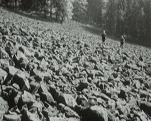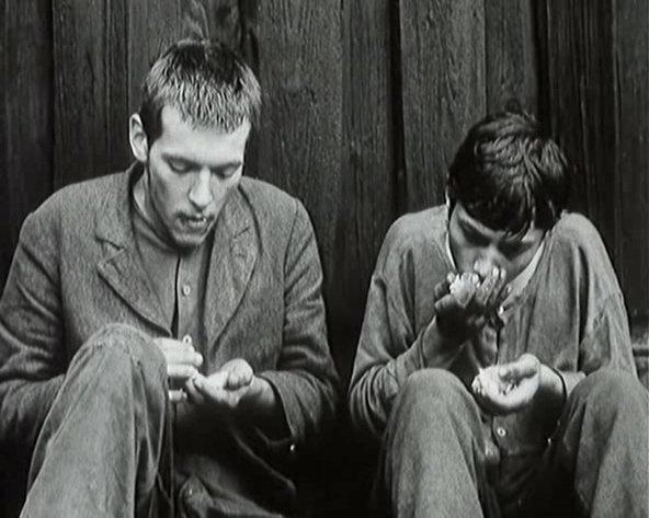 Continúan avanzando. Ante la vista de arroyo se lanzan a beber de él. Algún breve flashback que nos da a entender que en el pasado tenían una vida normal. Se sientan a arreglar como pueden sus zapatos absolutamente destrozados. Comen unas bayas. Hablan por primera vez en la película (y ya llevamos casi un cuarto de hora de metraje). La frase es simple: «Acércate a mí«. No parece haber ganas de malgastar el tiempo conversando. Todo queda reducido a no hacer ningún esfuerzo superfluo, a no perder el tiempo en nada que no les garantice su supervivencia.