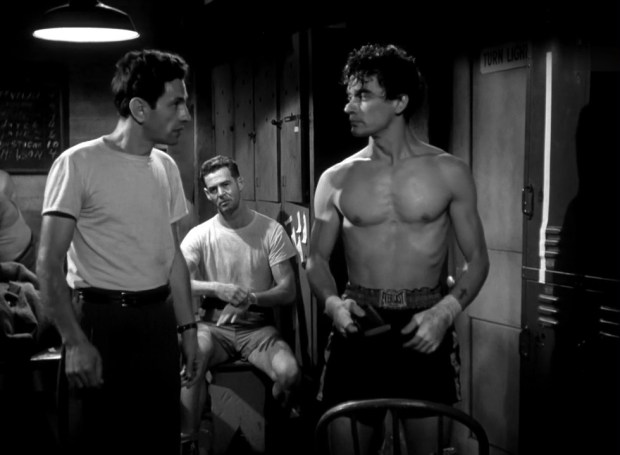 Es curioso que desagradándome tanto el boxeo, me gusten tanto las películas pugilísticas. Quizá porque es un deporte muy cinematográfico, al simbolizar muy bien esa lucha individual por lograr el éxito y tener un aspecto casi coreográfico que lo hace más agradecido de filmar que una competición de ping pong o de ajedrez. La escena del combate de Nadie Puede Vencerme es el momento más importante de la película, ya que está considerada una de las escenas de boxeo más influyentes de la historia del cine, algo avalado por el propio Martin Scorsese, que dirigió la que considero la mejor película sobre el tema, Toro Salvaje (Raging Bull, 1980). Aquí se mezclaron varios factores afortunados. Por un lado tanto el protagonista, el sensacional Robert Ryan (una debilidad personal mía y seguro que de muchos aficionados al Hollywood clásico), como su rival habían sido boxeadores con anterioridad. Por el otro Wise decidió filmar el encuentro con varias cámaras a la vez. El resultado le da una autenticidad y realismo que casi recuerdan a un combate televisado, ya que no tenemos la sensación de que los planos estén cuidadosamente preparados de antemano (aunque podría haber sido el caso).