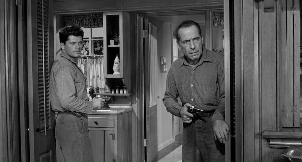En el caso de Horas Desesperadas (The Desperate Hours, 1955) no nos encontramos exactamente dentro del terreno del cine negro, tanto por una puesta en escena que no abusa de los claroscuros como por el acercamiento argumental, que no destapa las miserias de la familia protagonista, pero sin duda hay puntos en común con la idea de separar el sagrado hogar del peligroso mundo exterior. Aquí partimos de una conocida obra de Broadway que se trasladó a la pantalla en forma de película prestigiosa, dirigida por uno de los cineastas más reputados del Hollywood de la época, William Wyler, y encabezada por dos estrellas como Fredric March y Humphrey Bogart. Nada de esto es necesariamente negativo, pero sí que quizá haya hecho que el filme no sea tan apreciado como creo que merecería, ya que esta suma de talentos genera unas expectativas demasiado elevadas para lo que de todos modos es un filme más que notable.