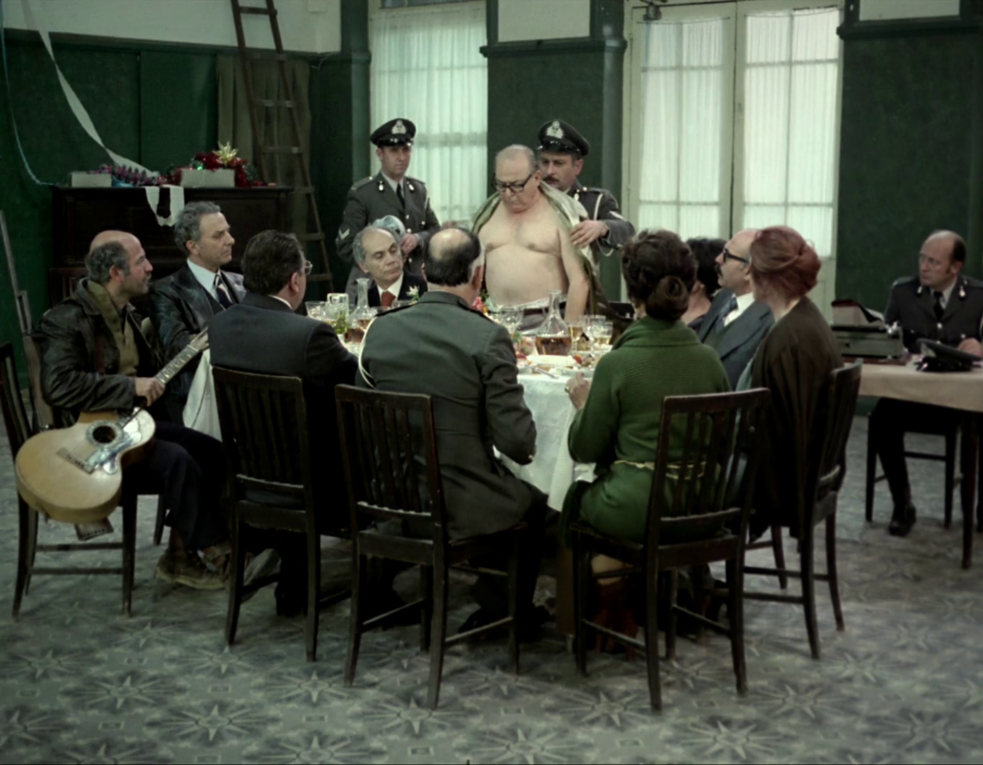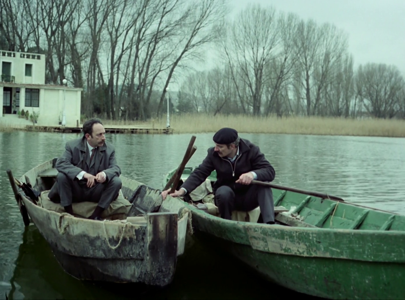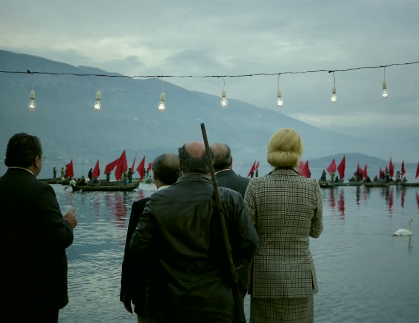 Hay aquí no obstante una característica que sí es muy inusual en el cine de Angelopoulos y que me sorprendió bastante y es cierto sentido del humor en algunas escenas de la película. Por ejemplo, en la escena inicial hay un plano en el pasillo del alojamiento que da a las diferentes habitaciones en que la cámara se mantiene estática mientras vemos cómo los personajes entran y salen de sus estancias discutiendo, y un personajillo de aspecto cómico intenta escaquearse y huir en silencio, pero es pillado in fraganti. Es inevitable que le venga a uno a la mente La Regla del Juego (La Règle du Jeu, 1939) de Jean Renoir o incluso la futura La Escopeta Nacional (1978) de Berlanga, aunque sea solo a nivel conceptual por utilizar una caza organizada entre altas personalidades como escenario para que los poderes fácticos lleguen a acuerdos entre ellos. Soy incapaz de imaginarme a un cineasta que hace casi siempre gala de un tono grave y contemplativo como Angelopoulos manejando comedia, pero estos instantes que ponen de manifiesto el patetismo de los personajes y lo incómodo de su situación son lo más cercano que le he visto (aunque quién sabe si en alguno de sus filmes que me falta por ver encontraré más ejemplos).