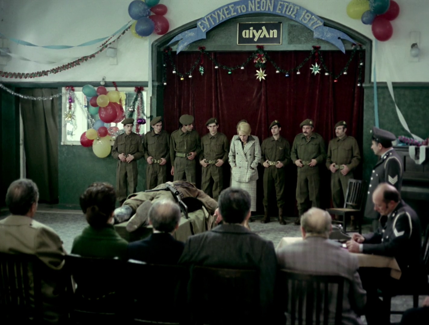 Esta misma descontextualización y dicho sentimiento de extrañeza vienen potenciados por el hecho de que Angelopoulos se muestra muy alejado del grupo de protagonistas, hasta el punto de que no sabremos gran cosa de muchos de ellos al acabar la película más allá, obviamente, de representar diferentes personalidades que se beneficiaron de los últimos hechos políticos del país y que, por tanto, tienen un sentimiento de culpabilidad soterrado. La idea del partisano que llevaba años enterrado bajo el hielo y emerge a la luz justo con el retorno de la democracia es una metáfora bastante obvia sobre esos crímenes del pasado que el establishment del país ha querido mantener convenientemente enterrados durante décadas y que ahora vuelven a hacerse públicos. La idea repetida una y otra vez de que la sangre del cadáver parece como si aún estuviera fresca hace el énfasis en cómo dicha herida infligida a una gran parte de la población sigue abierta y no ha cicatrizado correctamente.