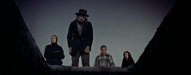 Para acabar de redondear una película ya de por sí singular, en que la pantera que da título al filme nunca llega a vislumbrarse y en que los dos actores más conocidos del reparto no se encuentran entre los personajes con más presencia en pantalla (aparte de Mitchum, está la magnífica Teresa Wright como Grace en un papel que nos puede parecer algo desaprovechado para su talento), hay que añadir que el trabajo de dirección de Wellman es cuanto menos peculiar, partiendo de que su gran propósito era ni más ni menos que filmar una película en blanco y negro en color… ¡palabras textuales suyas! Tal es así que pese a ser un filme en color, Wellman utiliza una paleta de tonos muy limitada favorecida por el paisaje nevado de alrededor de la casa, que hace que los pocos elementos que escapan de esa gama resulten aún más llamativos (el rojo de la chaqueta de Curt o la hoguera que Harold enciende al final). Pero no queda ahí la cosa, de hecho me llama la atención la composición bastante peculiar de algunos planos, que viniendo de un veterano como Wellman tenía que estar buscada a propósito: por ejemplo el plano del cadáver reposando en la habitación con la figura de Kurt a un lado mientras al fondo vemos a través de la puerta abierta a otros personajes moviéndose por la casa. O sin ir más lejos el llamativo plano del entierro, filmado prácticamente sin corte desde el agujero que se ha cavado para el féretro.