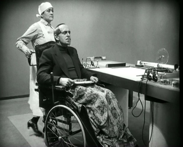 Pero he aquí un aspecto fundamental que dota de tantísimo interés a esta película, alejándola de las convencionales secuelas que se dedican simplemente a revisar los motivos y personajes de su obra precedente: en el primer Mabuse, ésta era una figura ultrapoderosa que se mezclaba en todos los ámbitos de la sociedad gracias a su capacidad de disfrazarse, aquí en cambio mantiene ese poder que le permite controlar todo, pero ya no es una figura de carne y hueso. Mabuse se convierte aquí pues en una figura maléfica inconcreta y casi diríamos abstracta. Es por ello que resulta importante que sea una secuela, porque como espectadores conocemos lo sumamente poderoso y casi irreductible que era Mabuse en la primera película, y eso hace que su nombre y su mera presencia, aunque sea de refilón, siga imponiendo. Pero éste es un Mabuse al que nunca vemos en acción, solo le oímos (y eso es en la teoría, ya que pronto sabremos que ni siquiera era su voz) y del cual solo vemos las consecuencias de sus planes. El genio del mal queda aquí pues dividido en dos: está el Mabuse real, al que vemos pero nunca escuchamos, que escribe toda una serie de planes diabólicos pero nunca los ejecuta; y luego el supuesto segundo Mabuse, al que nunca vemos pero que se manifiesta como una figura ejecutora de dichos planes.