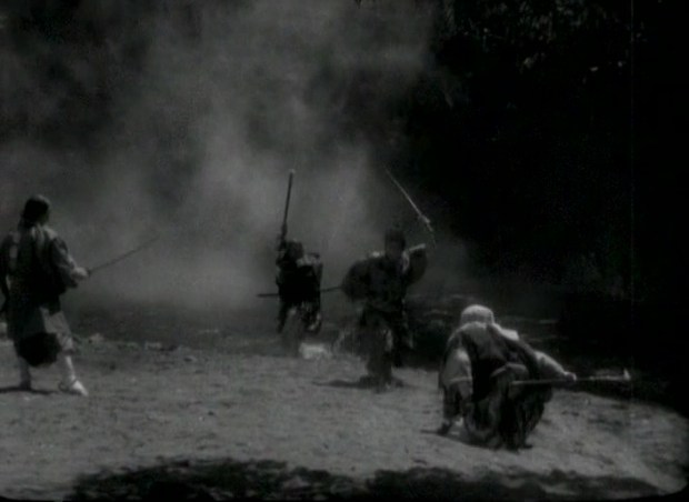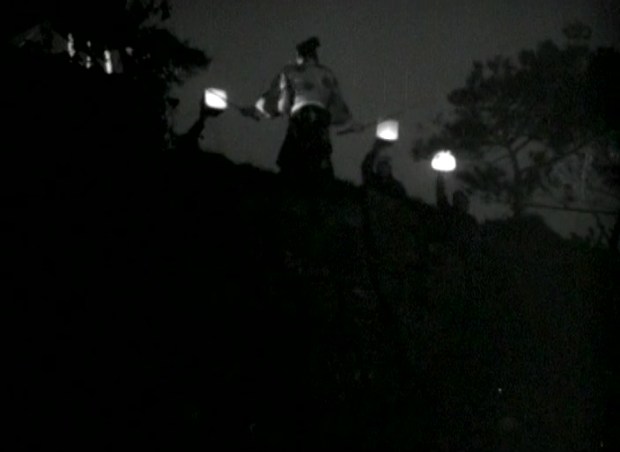 De Yamanaka pasamos pues a Mansaku Itami, considerado el otro cineasta de la época que dio un giro al género. Al igual que Yamanaka, su carrera como director fue breve, en su caso a causa de problemas de salud que le hicieron restringirse al papel de guionista; y de nuevo, al igual que su compañero, resulta difícil juzgar su filmografía por los poquísimos filmes suyos que se conservan. En cierta ocasión recuerdo que leí a alguien comentar que las películas que se pueden ver hoy día de Yamanaka probablemente no eran ni de las mejores de su carrera, sino simplemente las que tuvieron la suerte de llegar a nuestros tiempos, algo que podría ser cierto en el caso de la menor pero aun así más que notable Priest of Darkness (Kochiyama Soshun, 1936) pero que me cuesta creer respecto a las otras dos: soy incapaz de visualizar Humanidad y Globos de Papel y Sazen Tange and the Pot Worth a Million Ryo como obras menores de cualquier cineasta. No obstante, no acabo de estar seguro de si ése podría ser el caso de Itami y de su obra más difundida hoy día (es un decir), Akanishi Kakita (1936), una película sin duda valiosa y con muchos hallazgos pero demasiado extraña y desigual para considerar plenamente satisfactoria.