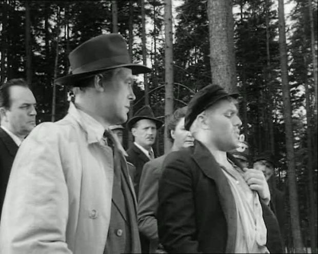 Siodmak, que siempre había destacado por sus puestas en escena tan góticas, no se sentía cómodo con este enfoque y de hecho a diferencia de Kazan o Dassin prefería mucho antes filmar en estudio que en exteriores. Por ello esta película, parcialmente filmada en Nueva York, tiene un estilo más contenido de lo habitual en él. Pero el estilo propio de Siodmak acaba al final imponiéndose, como queda de manifiesto en la forma que le imprime a espacios como el hospital o la cárcel que acaban haciéndose casi asfixiantes, o en algunos planos especialmente llamativos que rompen con una posible estética documental. Uno de ellos directamente es uno de los más impresionantes que he visto en su filmografía: aquél en que Martin va a visitar a la enfermera que fue cómplice en el robo de las joyas. Éste llama al timbre y vemos a través del cristal una figura recortada con el fondo que se va acercando. A cada puerta que cruza enciende una nueva luz dándole a esta aparición un toque casi espectral, hasta que llega a la puerta principal y entonces la podemos ver con detalle. Dicho recurso sin duda se beneficia del imponente físico del personaje de la enfermera, quien de lejos parecía simplemente una mujer y de cerca se revela como una presencia amenazadora.